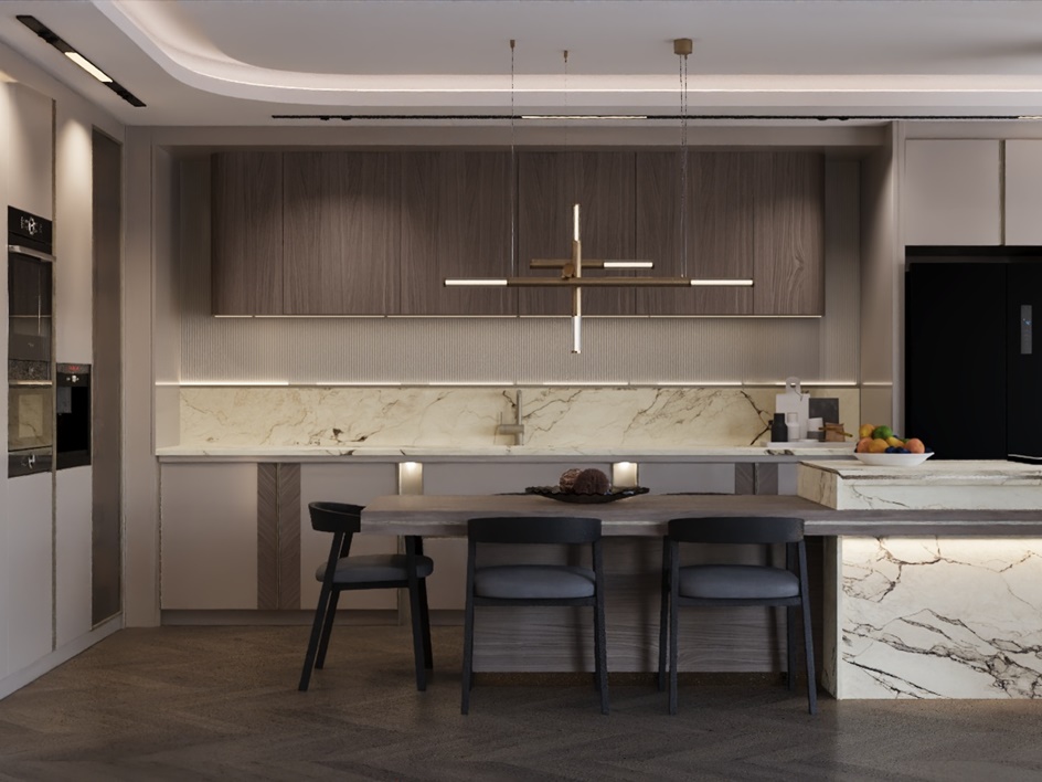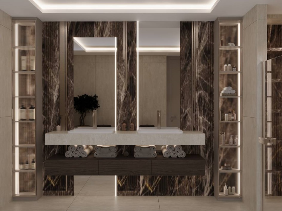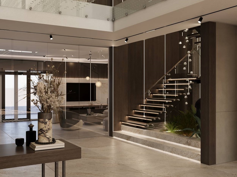 “Beysu Konakları’nda konumlanan bu dubleks daire, geniş hacimli mekânları kontrollü bir tasarım diliyle dengeleme hedefiyle ele alındı. Ahşap, doğal taş ve yumuşak geçişli yüzeyler; güçlü bir aydınlatma kurgusuyla bir araya getirilerek mekânlar arasında süreklilik sağlandı. Yaşam alanlarından özel hacimlere, çocuk odalarından teras ve kış bahçesine kadar tüm alanlarda; konforlu, sakin ve zamansız bir yaşam anlayışı benimsendi.”