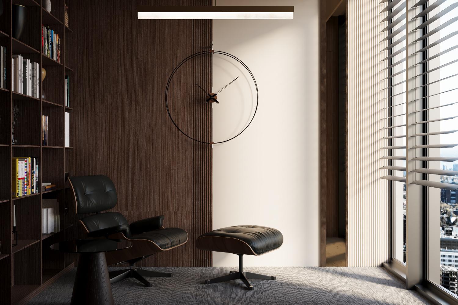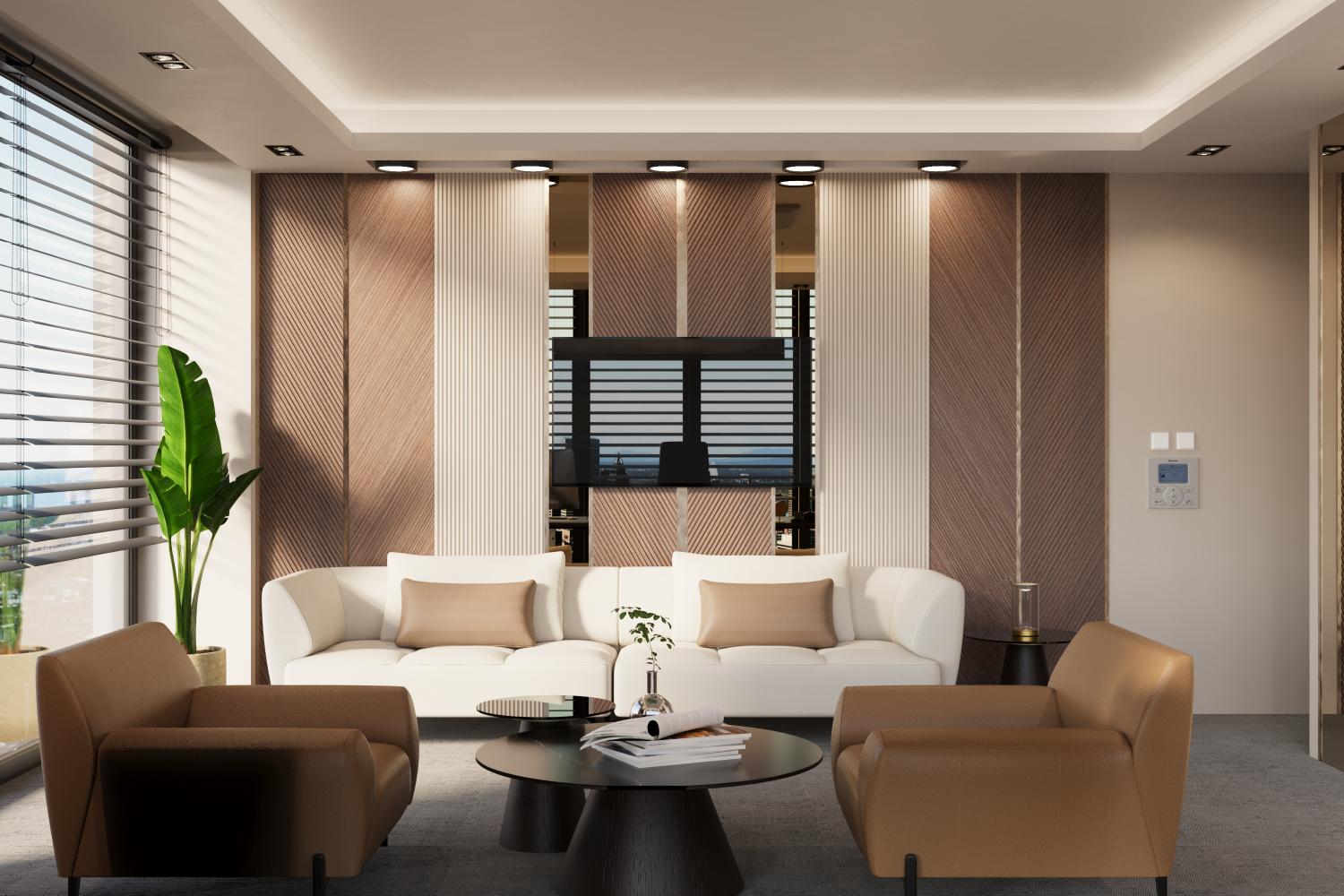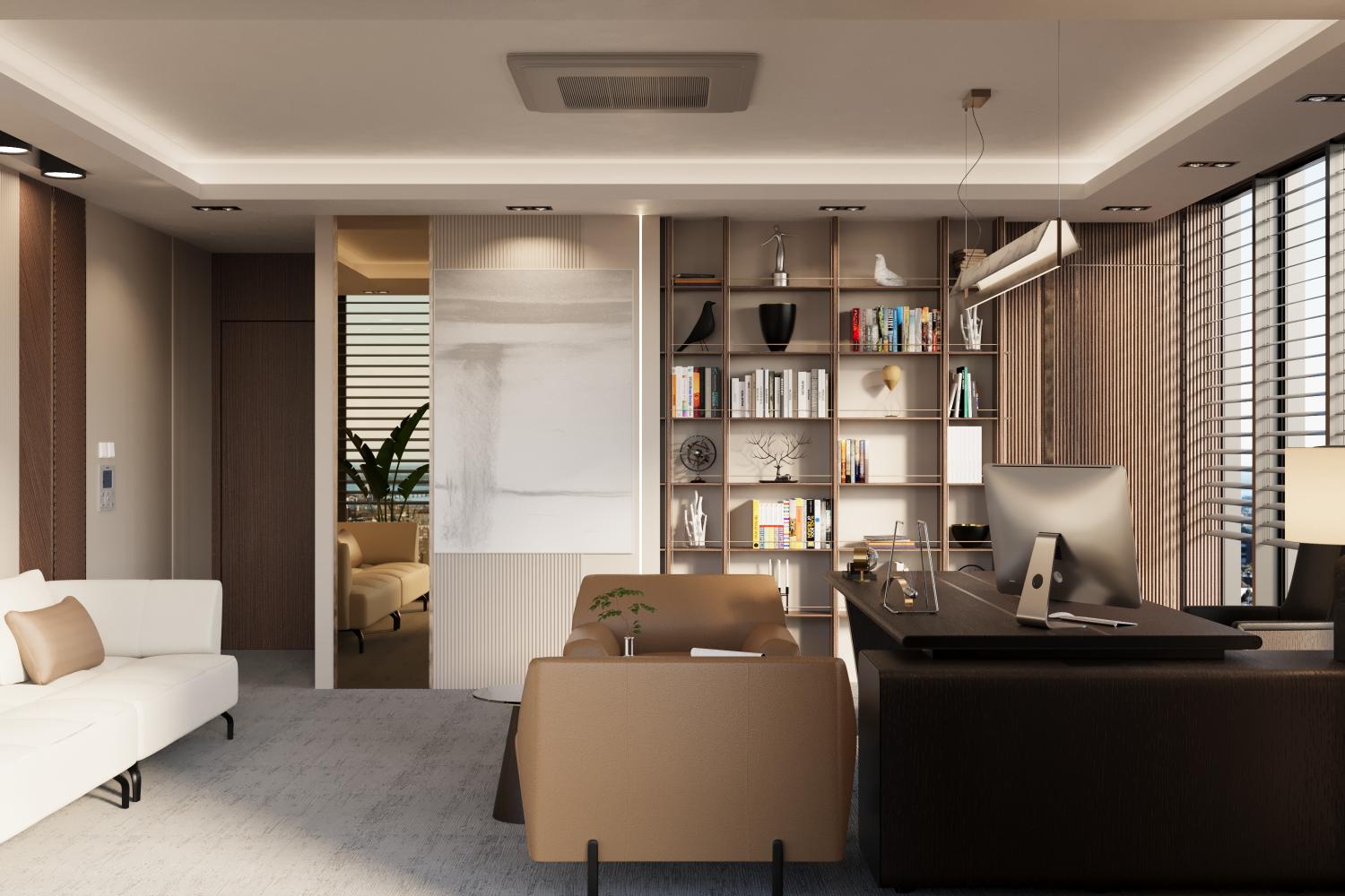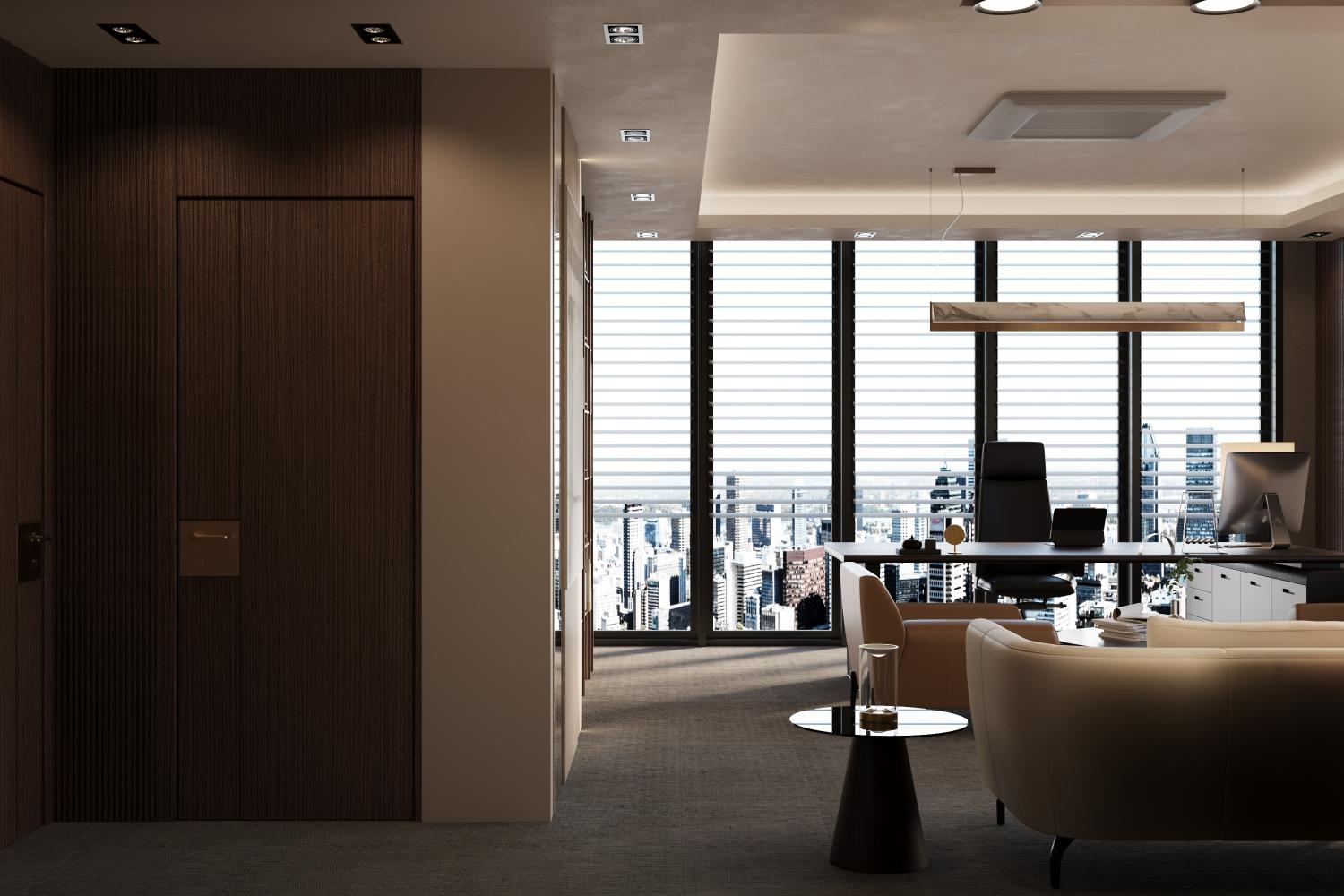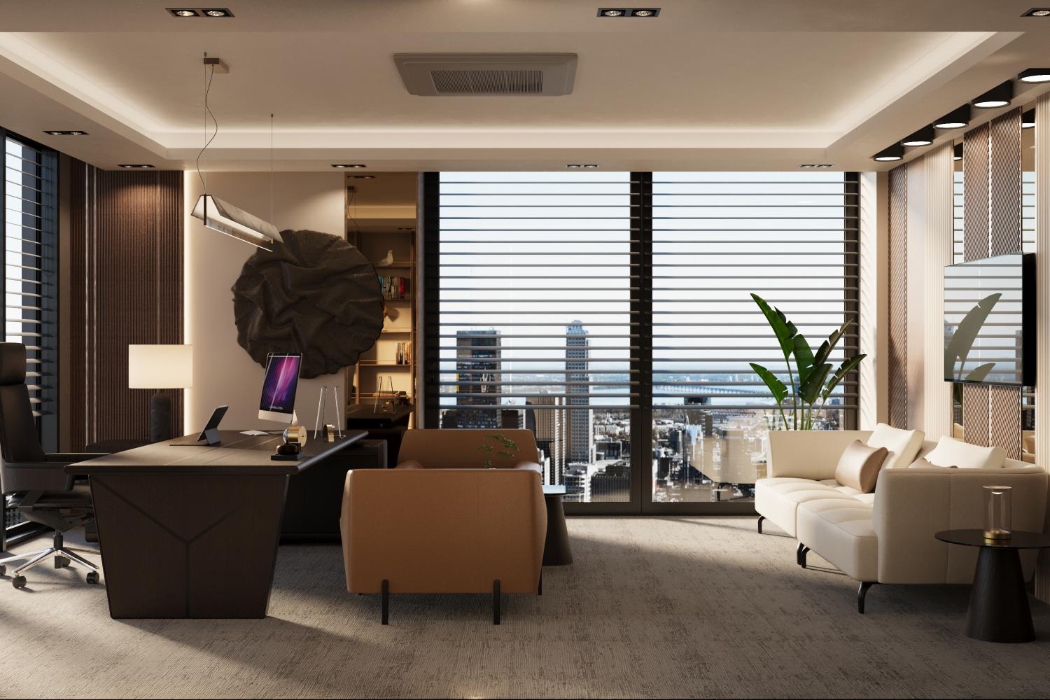 Doğal tonlar, sıcak ahşap yüzeyler ve dengeli aydınlatma diliyle; temsil gücü yüksek, zamansız ve sakin bir çalışma ortamı tasarlandı. Ofis, gösterişten uzak ancak karakterli bir duruşla, verimli ve uzun ömürlü bir kullanım anlayışını yansıtmaktadır.”